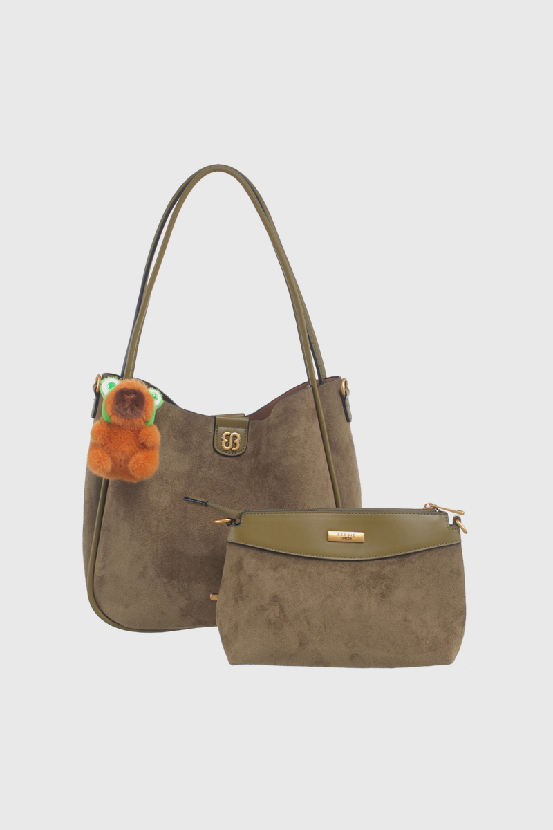 Features: Slouch Bag | Shoulder Bag | Faux-Suede | Charm | Pouch | Fully Lined Interior | Detachable Strap | Snap Closure | Shoulder Straps